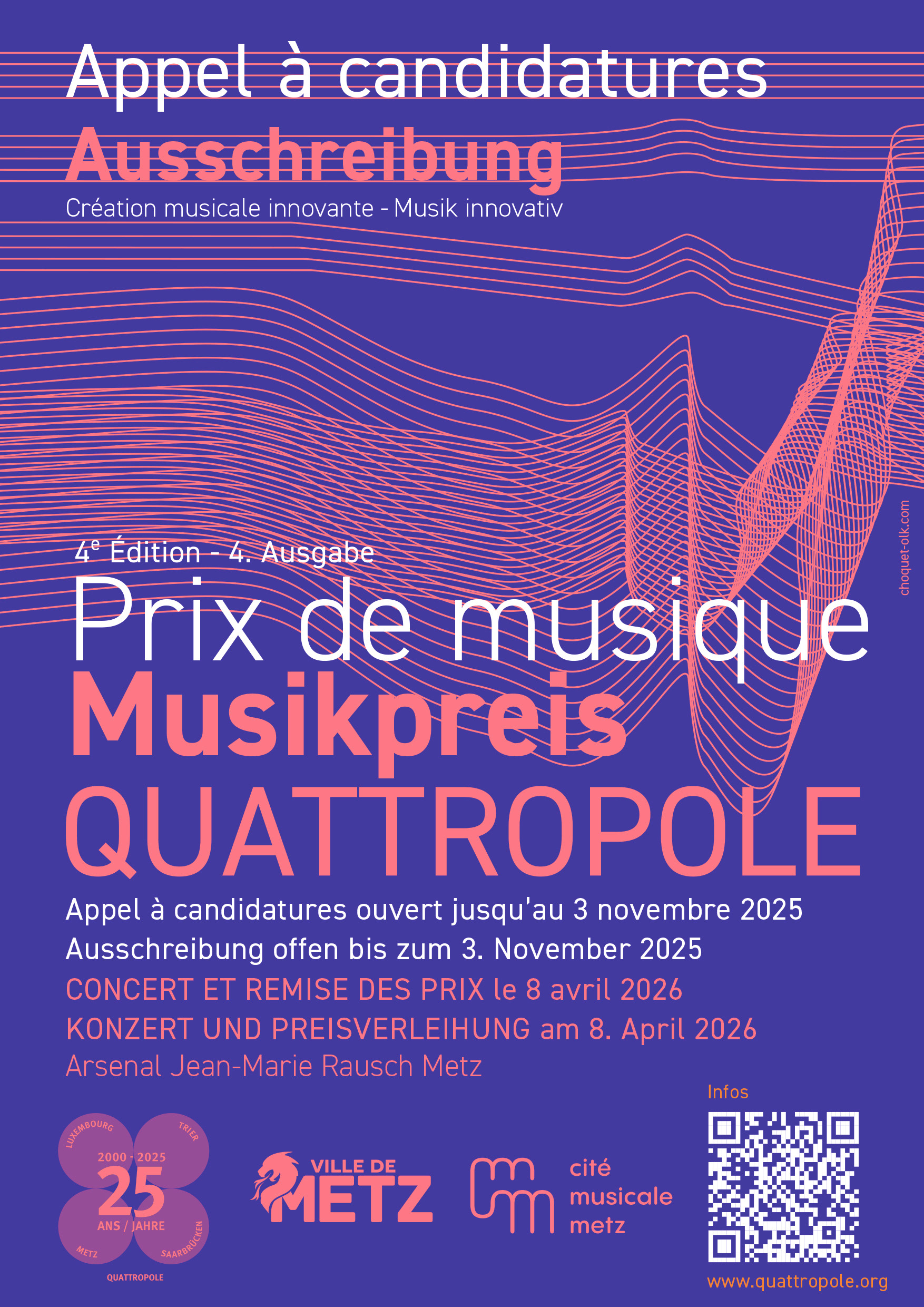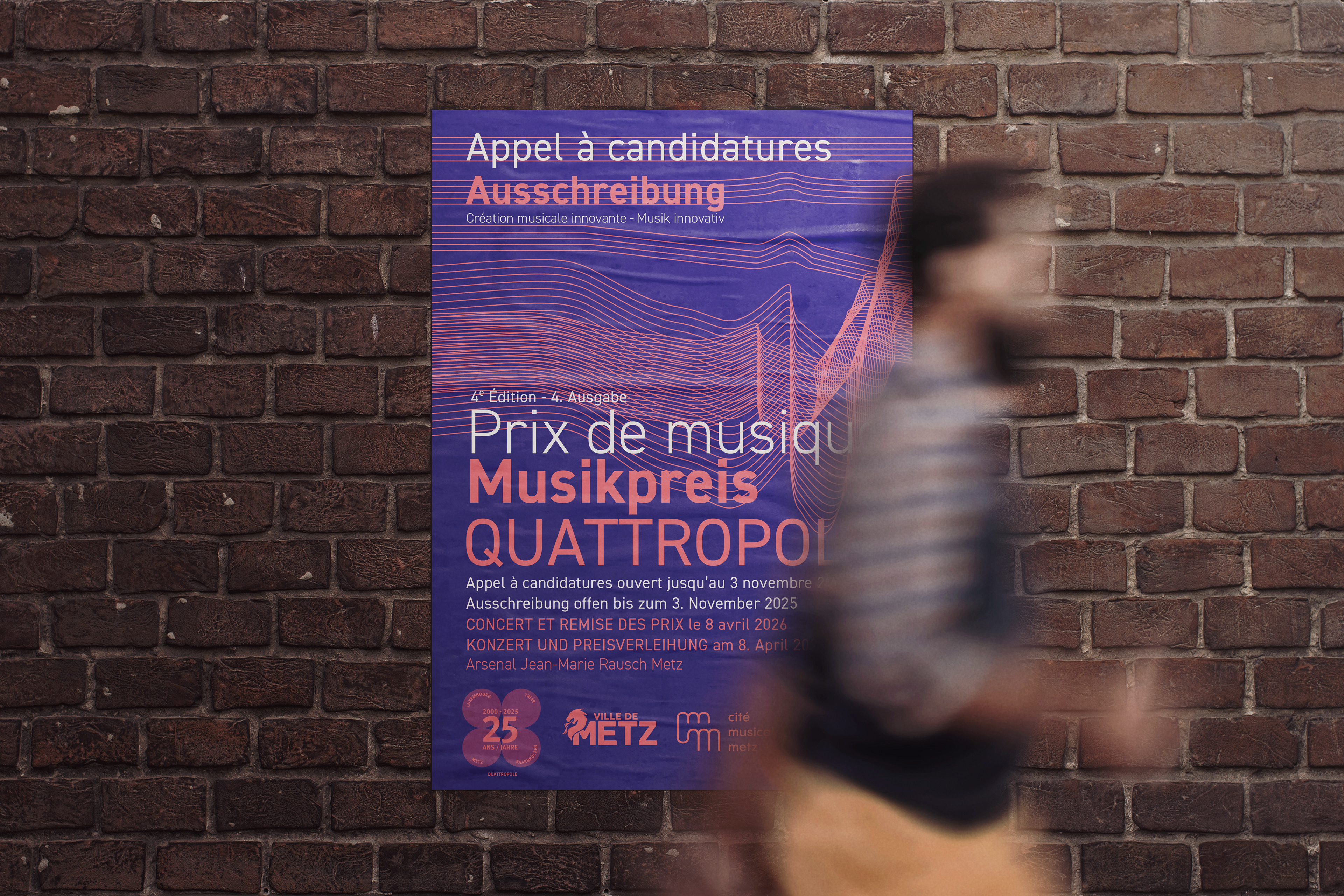 Conception et réalisation des visuels, affiches, flyer et visuels pour réseaux sociaux de l'appel à candidatures du concours de création musicale innovante organisé par Quattropole, qui se tient chaque année sur la Grande Région. Le concept du visuel consiste à jouer avec les lignes d’une portée de partition qui semblent se transformer, onduler… le visuel faisant ainsi référence à la légèreté de la musique, à des représentations d'ondes sonores tout en ayant un aspect technique, moderne et en restant inscrit dans la ligne de communication de l'événement qui se tient depuis quelques années maintenant.…