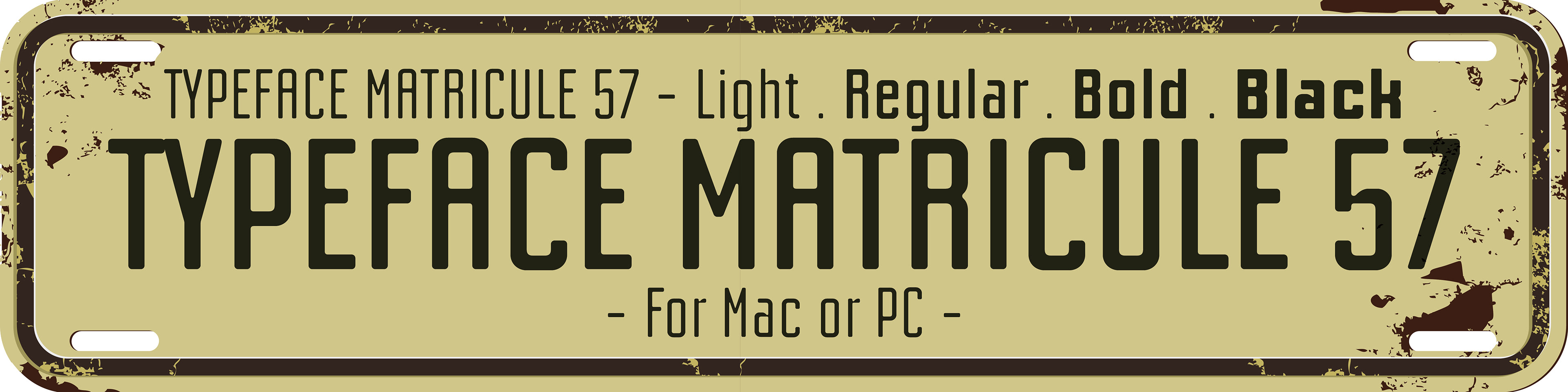 Matricule 57 est un caractère dont le design et inspiré par les plaques d’immatriculations et plus particulièrement par les déformations provoquées par la pression des caractères dans les plaques métalliques. Ces déformations donnent aux caractères un style spécifique notamment concernant les déliés de liaisons de ces caractères.